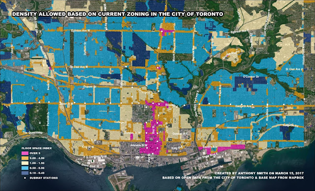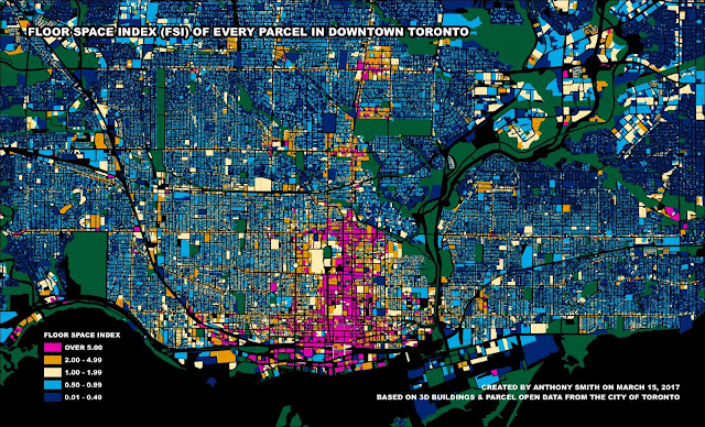 I am pleased to share the following interactive map that displays the estimated gross floor space index (FSI) for every parcel in downtown Toronto. This is based on the intersection of 3D massing data and parcel data obtained from the City of Toronto open data portal. Click on any parcel to see the FSI:
