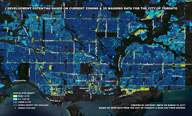 This is a highly experimental analysis so I am sure there are many minor issues with the exact accuracy of the data per parcel. For example this is gross density, based on the total building height, so it does not reflect the exclusion of mechanical areas or community spaces that usually exempt from traditional net FSI calculations used by the city for approvals. But overall, the patterns provide a starting point for understanding where redevelopment is most likely to occur based on the current zoning.